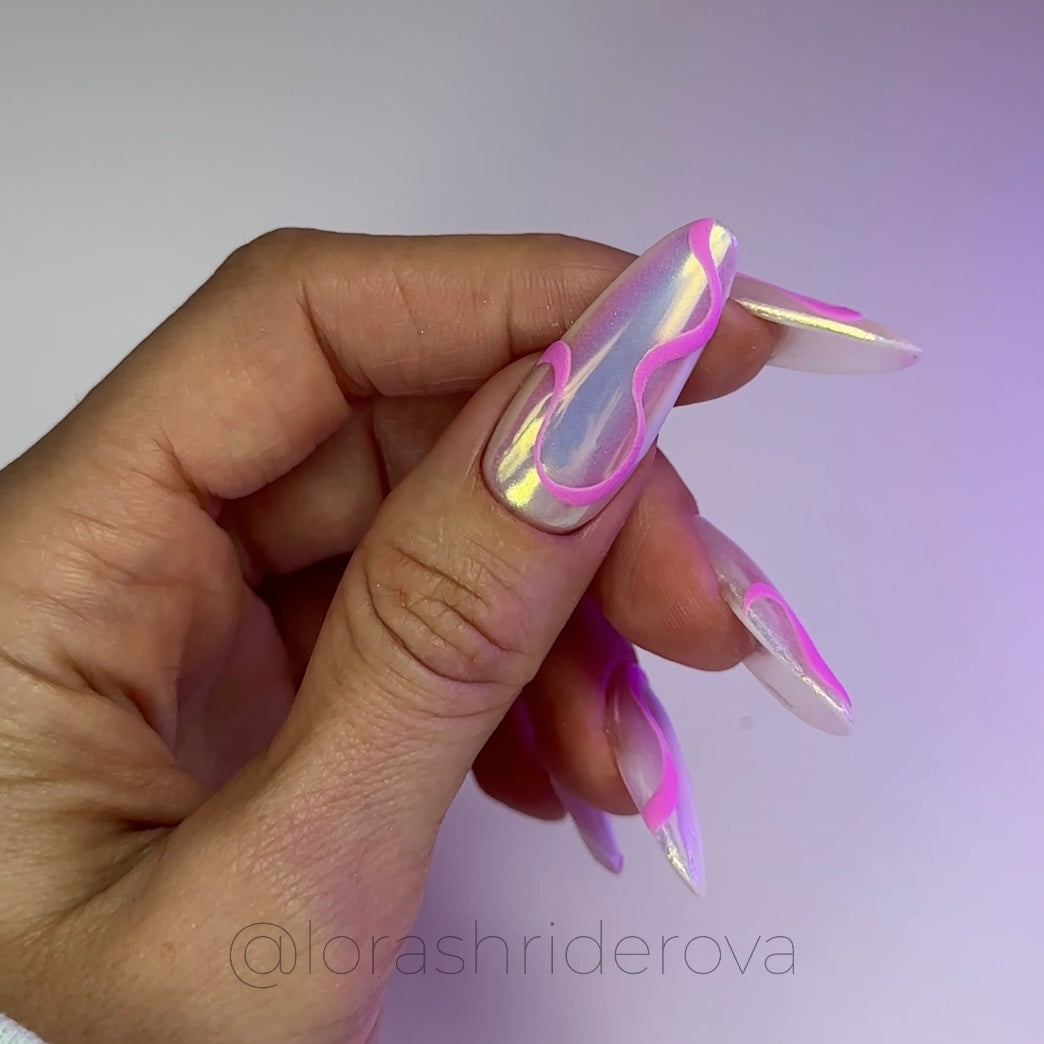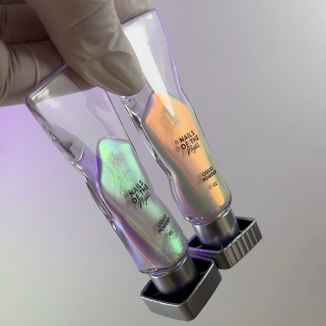 NAILSOFTHENIGHT Liquid Powder 01 es un innovador polvo líquido con efecto camaleón, que cambia de verde a morado, creando un acabado iridiscente espectacular.